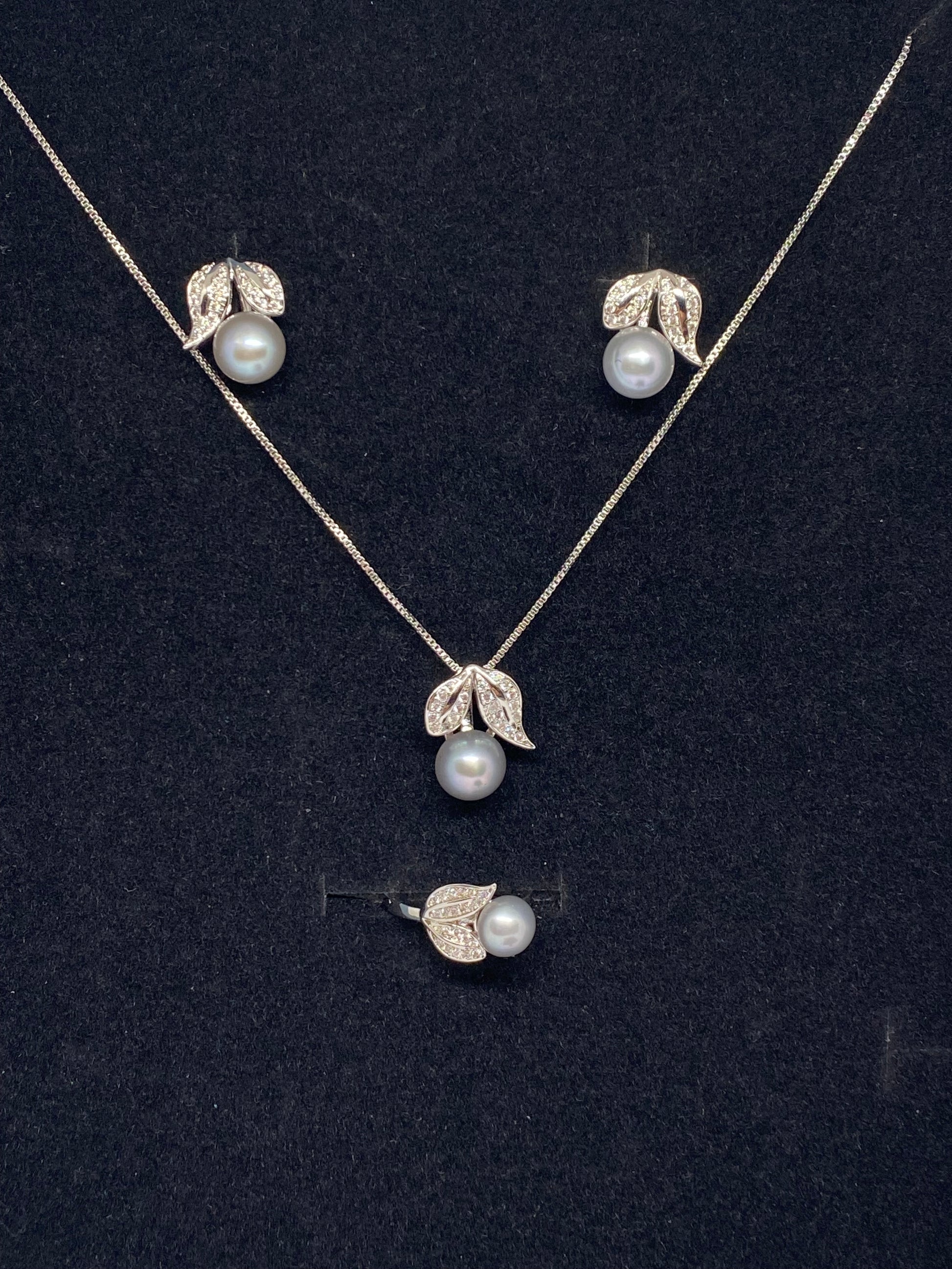 Sterling Silver 3 piece Set of ( Necklace, EarringStuds and Ring) with Freshwater Pearl  and Cubic Zirconia Stones.